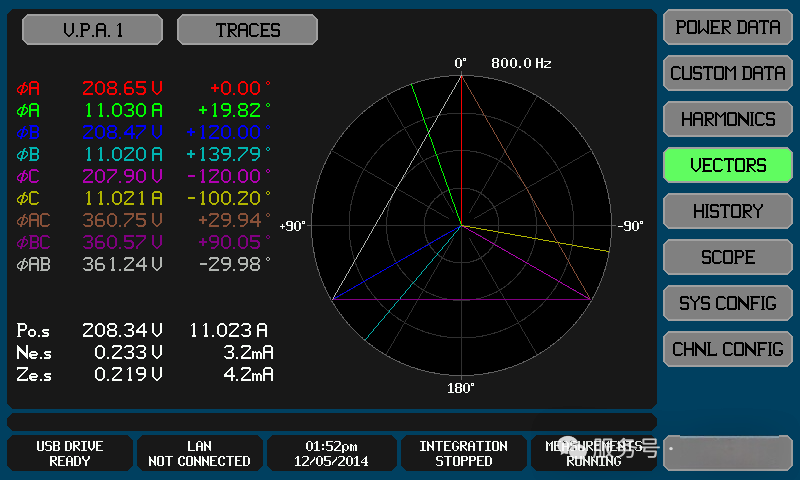 矢量屏幕(图5)以极坐标图形式展示选定通道或VPA 的基本电压和电流矢量,对于多相 VPA,还能显示相间电压和非测量中性相矢量,最多可同时显示10个矢量,并可自由选择颜色。